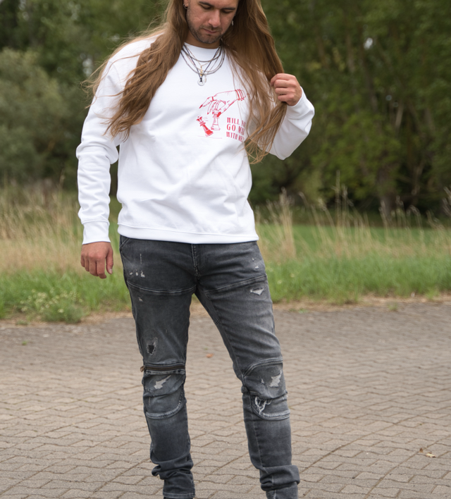 Weißes Sweatshirt aus 80 % Baumwolle und 20 % Polyester mit rotem Druck zum Song „Pardon Me“. Auf der Vorderseite befindet sich die Hand mit Schachfigur und dem Schriftzug „WILL YOU GO MAD WITH ME“. Auf der Rückseite stehen „PARDON ME“ und „CAN YOU FEEL THE MADNESS DRIPPING FROM YOUR SKIN?“ über dem passenden Motiv sowie dem Schriftzug POSTMODERN FANTASY. Der Druck wird handgemacht aufgebracht, daher können leichte Abweichungen in Farbe und Ausführung auftreten. Unisex geschnitten und angenehm zu tragen.
