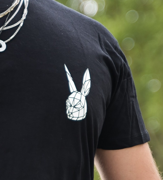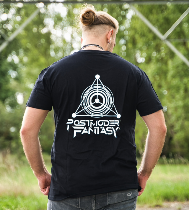 Schwarzes T-Shirt aus 100 % Baumwolle mit weißem Hasenlogo auf der linken Brustseite sowie großem Postmodern-Fantasy-Logo mit Schriftzug auf der Rückseite, offizielles Band Merch. Der Druck wird handgemacht aufgebracht, daher können leichte Abweichungen in Farbe und Ausführung auftreten. Klare weiße Linien sorgen für einen deutlichen Kontrast zum schwarzen Stoff. Unisex geschnitten und angenehm zu tragen.