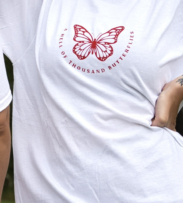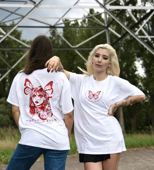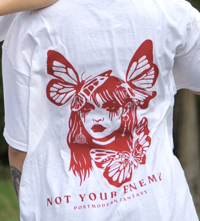 Weißes T-Shirt aus 100 % Baumwolle mit rotem Frontprint in Form eines Schmetterlings und dem Schriftzug „A HELL OF THOUSAND BUTTERFLIES“, offizielles Band Merch. Auf der Rückseite befindet sich ein großflächiges Motiv mit Illustration sowie dem Statement „NOT YOUR ENEMY“ und dem Postmodern-Fantasy-Schriftzug. Der Druck wird handgemacht aufgebracht, daher können leichte Abweichungen in Farbe und Ausführung auftreten. Unisex geschnitten und angenehm zu tragen.