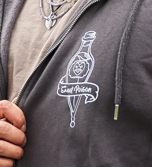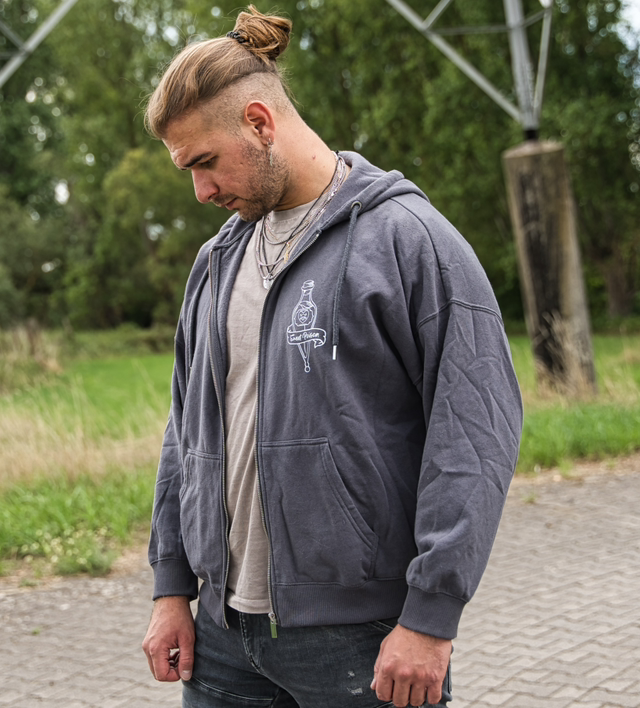 Grauer Zip-Hoodie aus mindestens 60 % Baumwolle und einem hochwertigen Mischgewebe. Auf der Vorderseite befindet sich das weiße „Sweet Poison“-Flaschenmotiv. Die Rückseite zeigt das Postmodern-Fantasy-Logo ebenfalls im weißen Druck. Der Druck wird handgemacht aufgebracht, daher sind leichte Abweichungen in Farbe und Ausführung möglich. Mit Kapuze, Kordeln und großer Kängurutasche für maximalen Komfort. Unisex geschnitten und angenehm zu tragen.